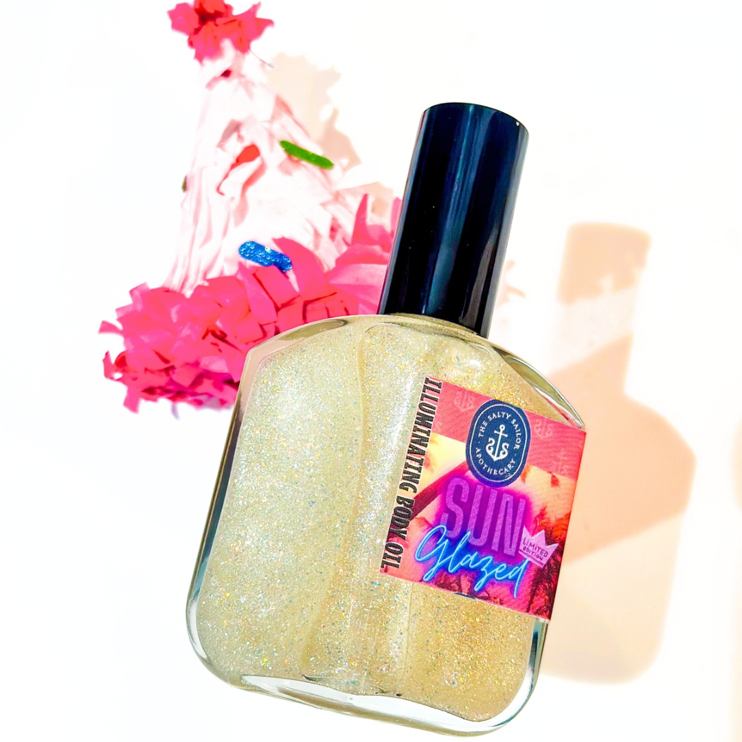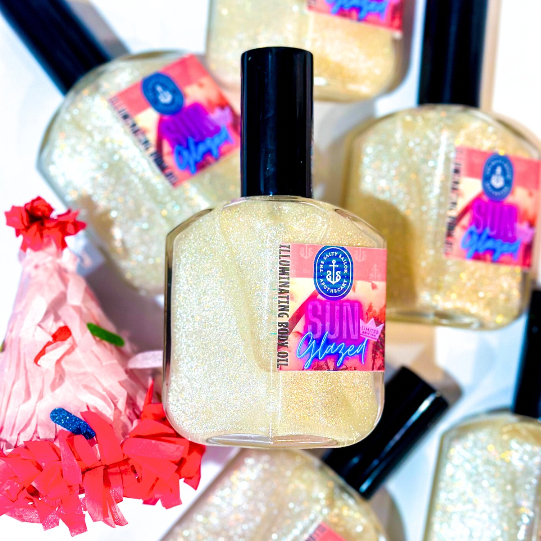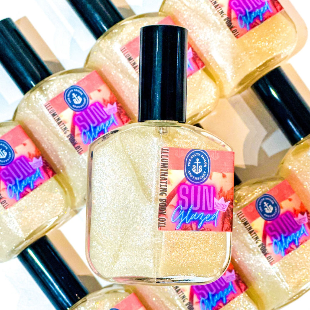 Sun Glazed is a bottle of sheer sparkling, yet indulging body oil….it took months to nail down a formula that was light & quick absorbing BUT could keep the sparkling goodness suspended without the need to shake the absolute beeejeeeeezus out of it (like most sparkling things on the market😉)!